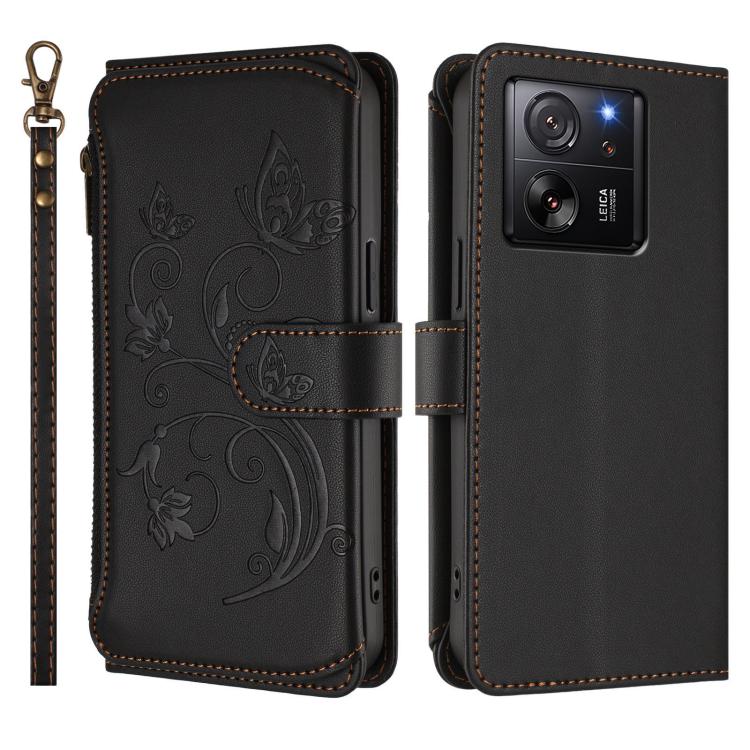 Funda de cuero con cremallera para Xiaomi 13T / 13T Pro / Redmi K60 Ultra, diseño de mariposas, flores y mariposas (negro)