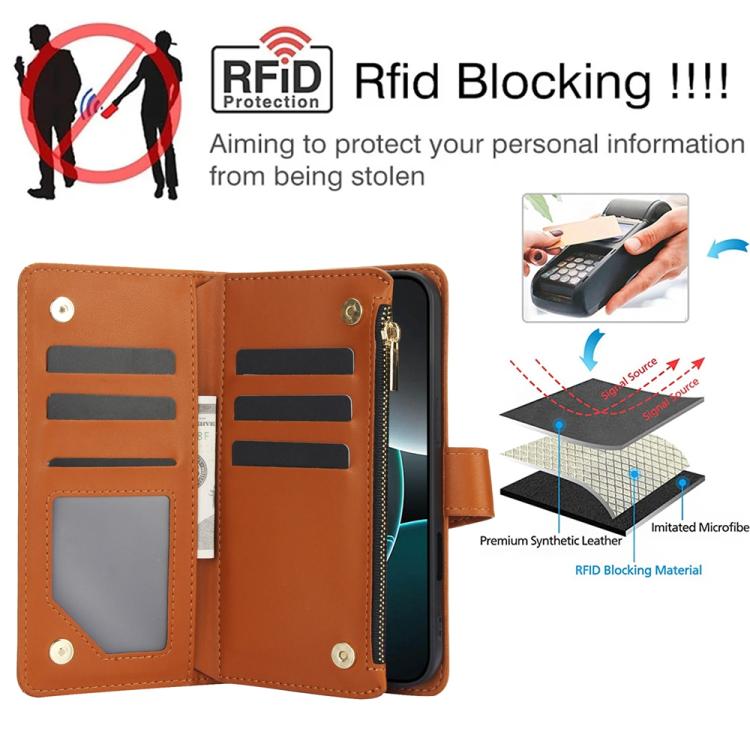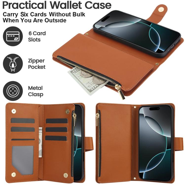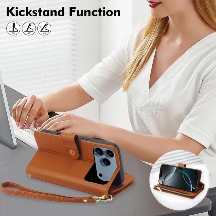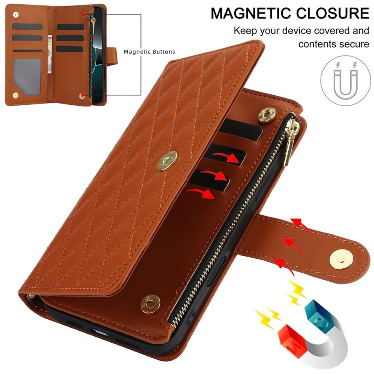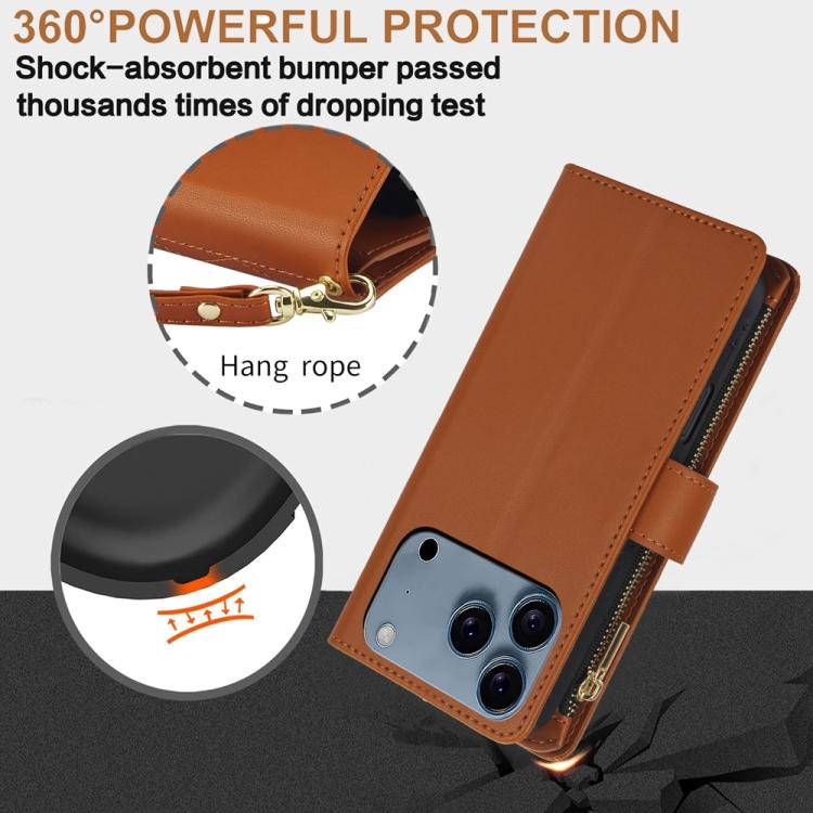 Funda de cuero con cremallera rombal para iPhone 17 Pro YM016 con tarjetero y cordón (marrón)