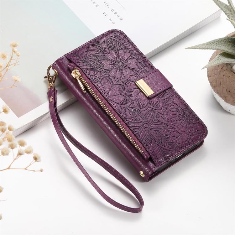 Funda de cuero con cremallera y correa para Samsung Galaxy A15, diseño de flores y hojas (morado)