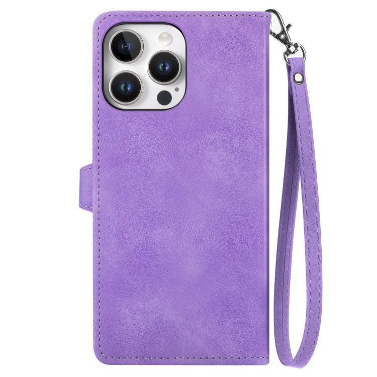 Funda de Cuero con Cremallera para iPhone 16 Pro Diseño de Flores En Relieve (Morado)