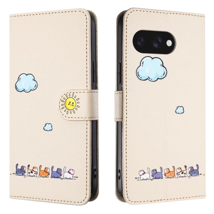 Funda de Cuero para Google Pixel 9A con Dibujos de Gatos (Beige y Blanco)