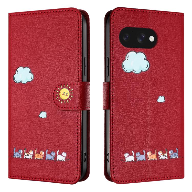 Funda de Cuero con Dibujos de Gatos para Google Pixel 9A (Rojo)