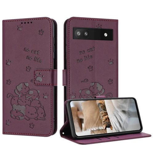Funda de Cuero para Google Pixel 6A con Diseño de Gatito en Relieve y Cordón (Rojo Vino)