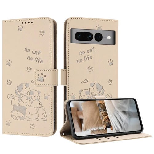 Funda de Cuero Google Pixel 7 Pro con Diseño de Gatito en Relieve y Cordón (Beige)