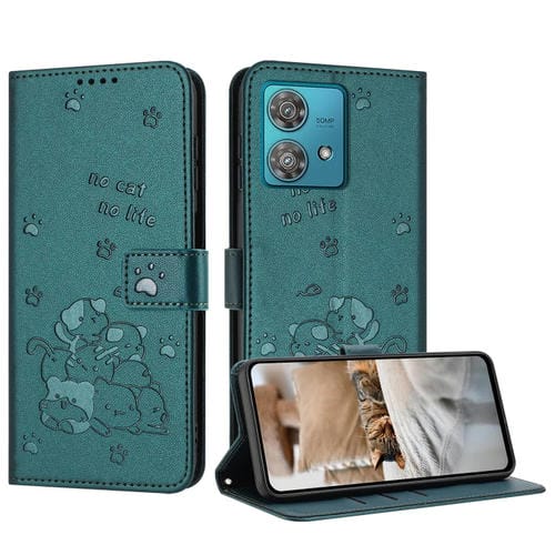 Funda de Cuero Motorola Edge 40 Neo con Diseño de Gatito en Relieve y Cordón (Verde Oscuro)