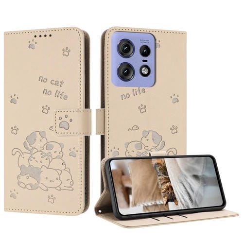 Funda de Cuero para Motorola Edge 50 Pro con Diseño de Gatito en Relieve y Cordón (Beige)