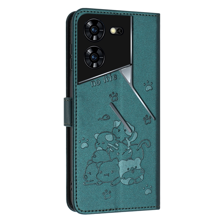 Funda de Cuero para Tecno Pova 5 Pro con Diseño de Gatito en Relieve y Cordón (Verde Oscuro)