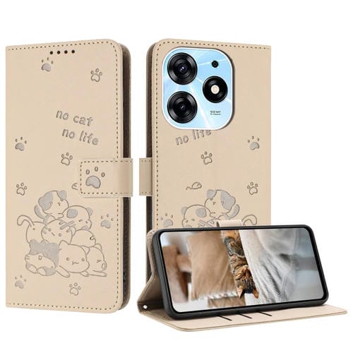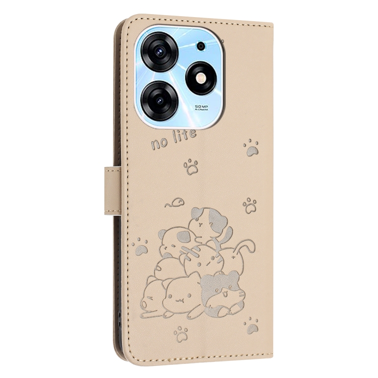 Funda de Cuero para Tecno Spark 10 Pro K17 4G con Diseño Gatito en Relieve y Cordón (Beige)