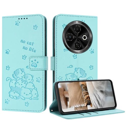 Funda de Cuero para Tecno Spark 30C con Diseño de Gatito en Relieve y Cordón (Verde Menta)