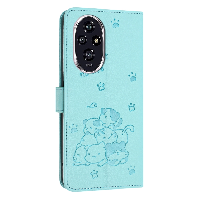 Funda de Piel para Honor 200 Pro 5G con Diseño de Gatito en Relieve y Cordón (Verde Menta)