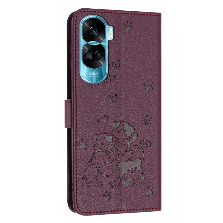 Funda de Piel con Diseño de Gatito en Relieve y Cordón para Honor 90 Lite/X50I 5G (Rojo Vino)