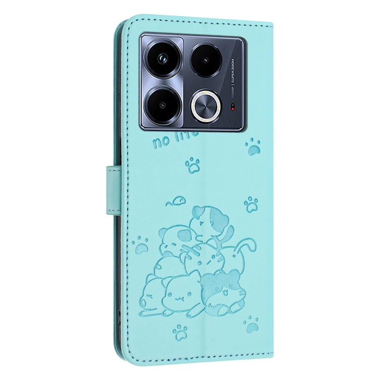 Funda de Cuero Infinix Note 40 5G con Diseño de Gatito En Relieve y Cordón (Verde Menta)