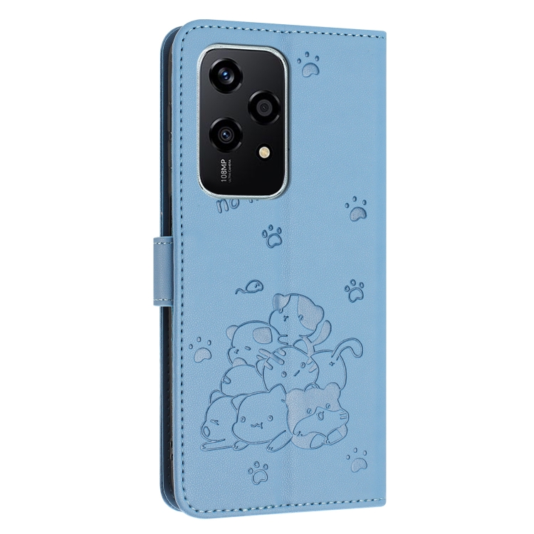 Funda de Cuero con Estampado de Gatito y Cordón para Honor 200 Lite 5G (Azul)