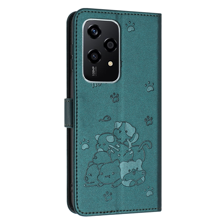 Funda de Cuero con Estampado de Gatito y Cordón para Honor 200 Lite 5G (Verde Oscuro)