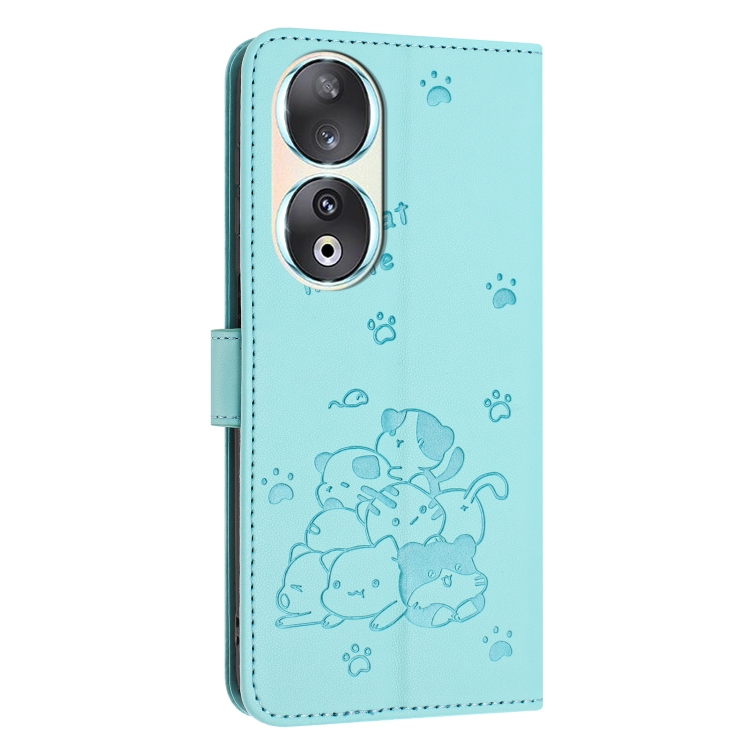 Funda de Piel con Diseño de Gatito en Relieve para Honor 90 con Cordón (Verde Menta)