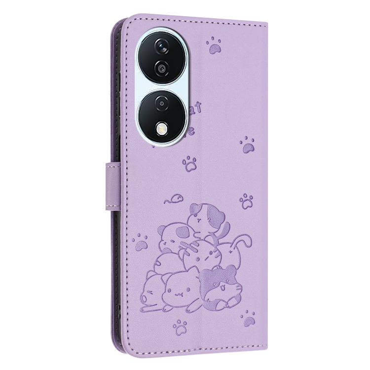Funda de Piel para Honor X7B 4G/5G con Diseño de Gatito en Relieve y Cordón (Morado)