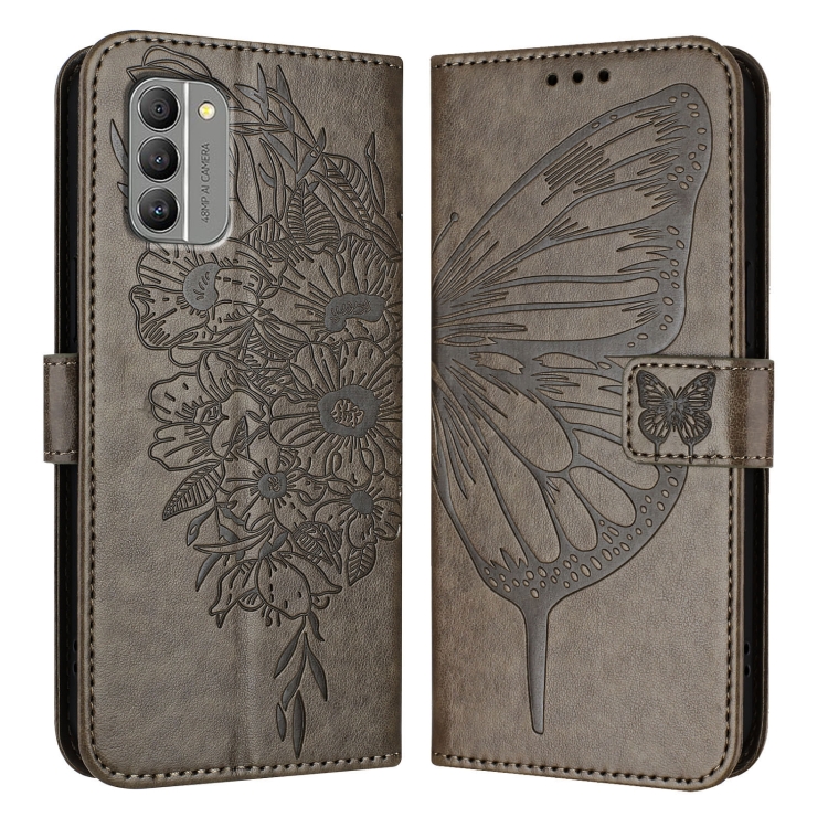 Funda de Cuero para Nokia G400 con Diseño de Mariposa en Relieve (Gris)