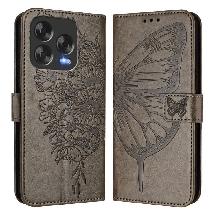 Funda de Cuero para ZTE Blade V70 con Diseño de Mariposa en Relieve (Gris)