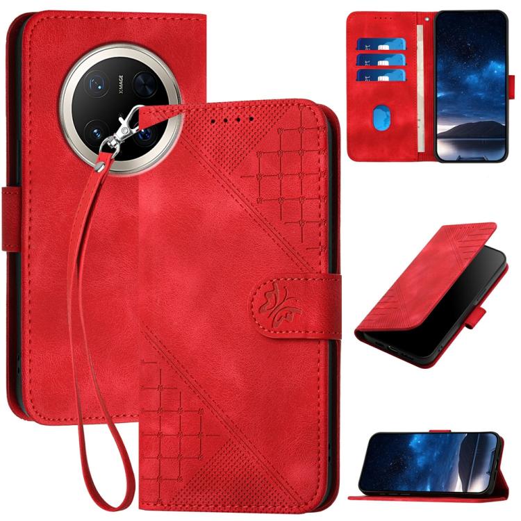 Funda de Cuero Huawei Mate 70 Pro y Mate 70 Pro+ con Mariposa en Relieve y Cordón (Rojo)