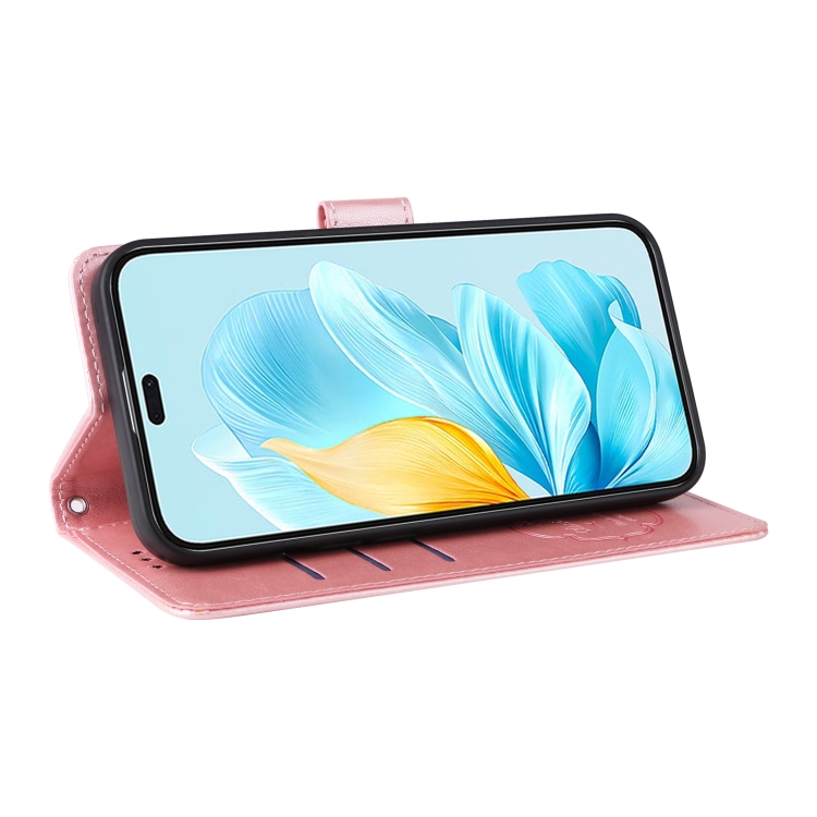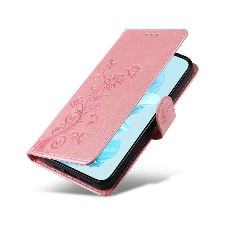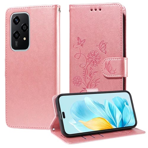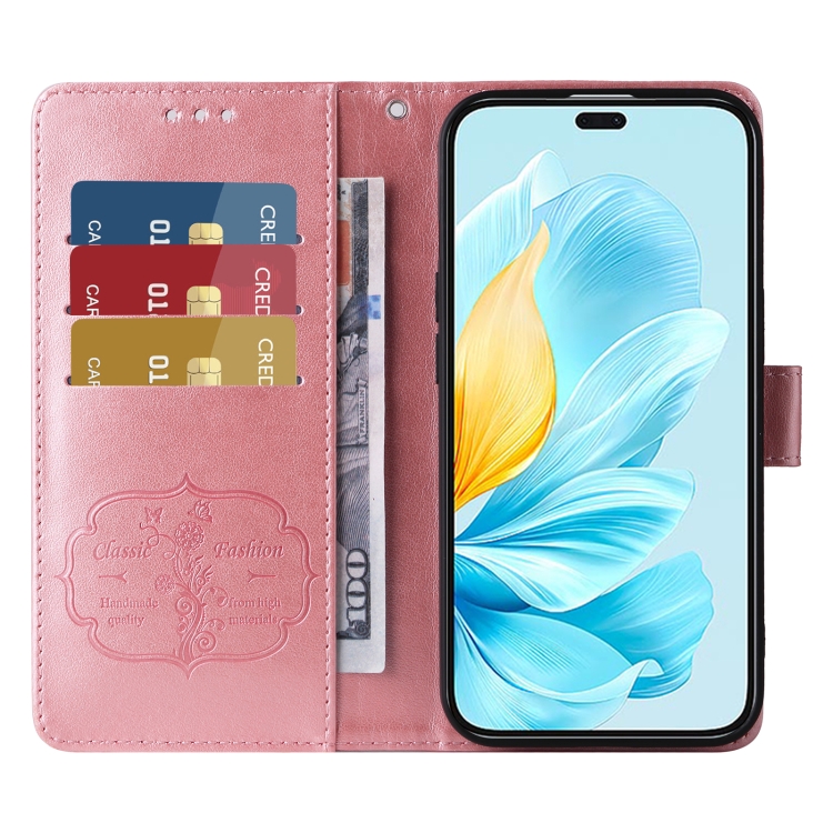 Funda de Cuero Honor 200 Lite con Diseño de Mariposas y Flores en Relieve (Oro Rosa)