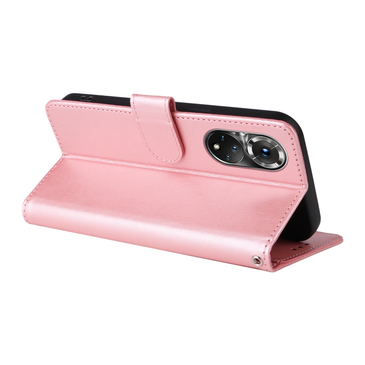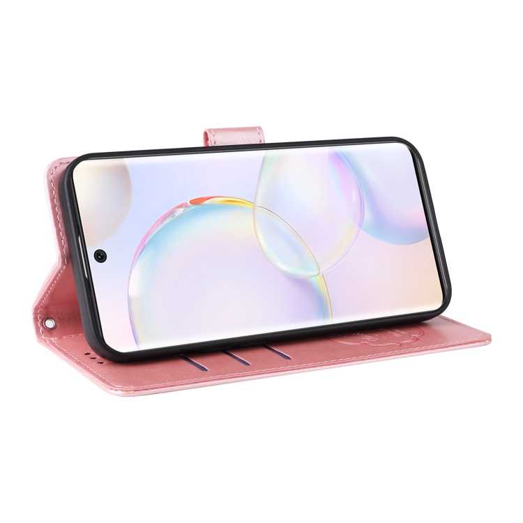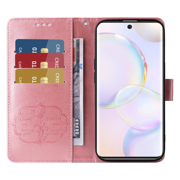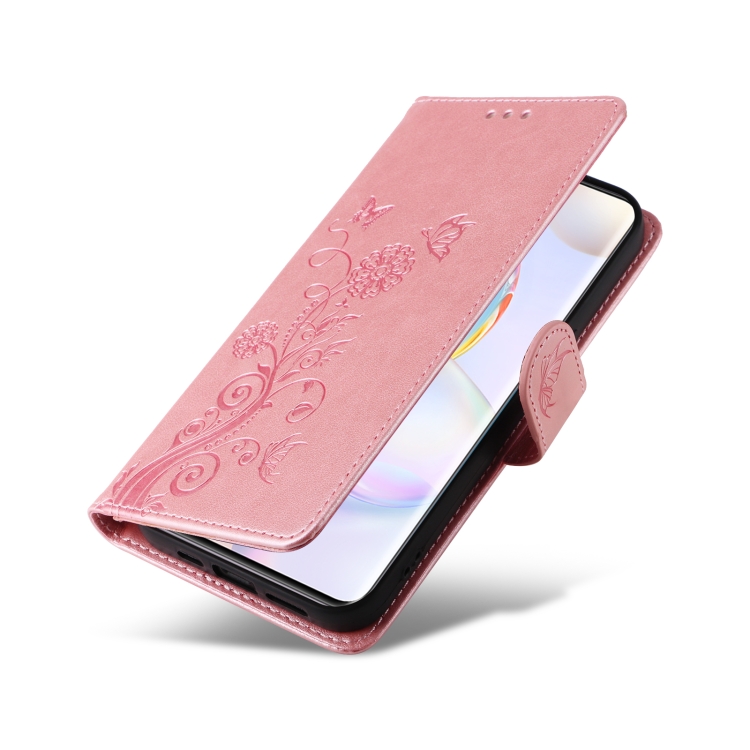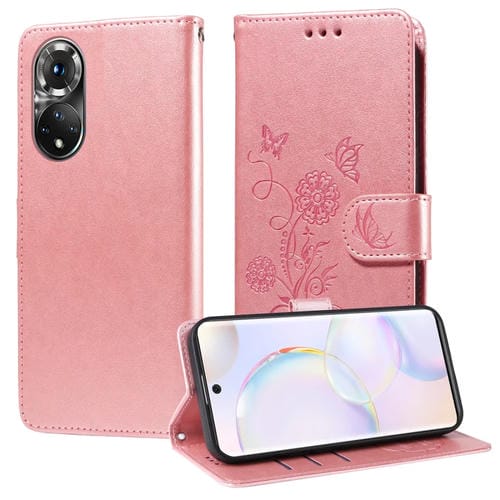 Funda de Cuero para Honor 50 5G Huawei Nova 9 con Diseño de Mariposas y Flores en Relieve (Oro Rosa)