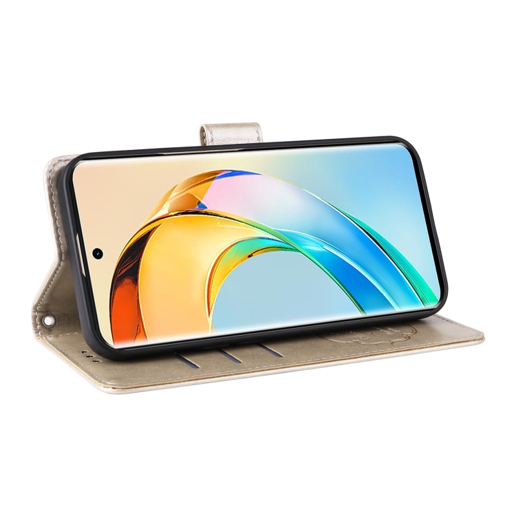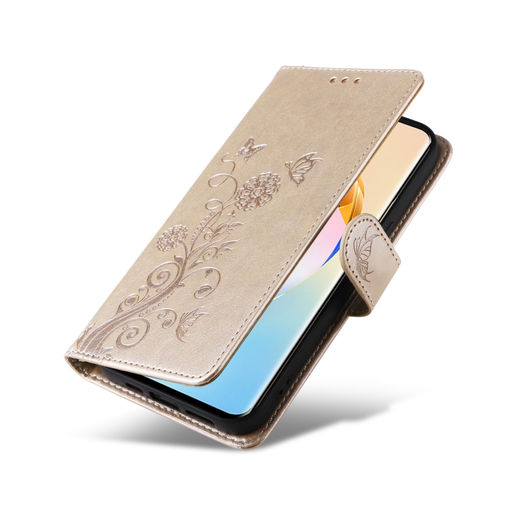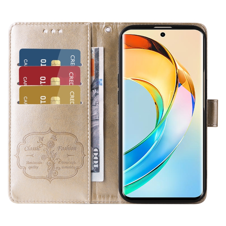 Funda de Cuero para Honor X50 Gt y X50 Pro con Diseño de Mariposas y Flores en Relieve (Dorada)