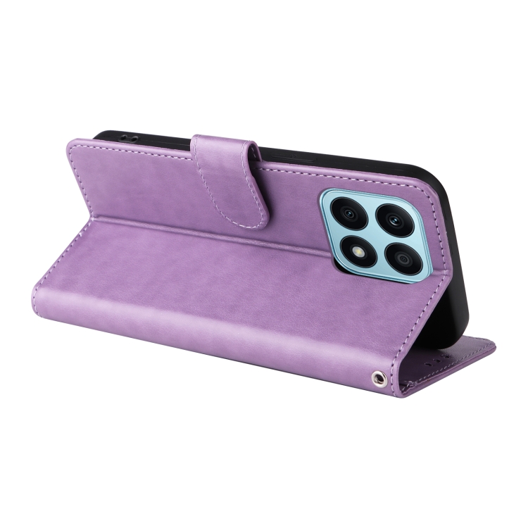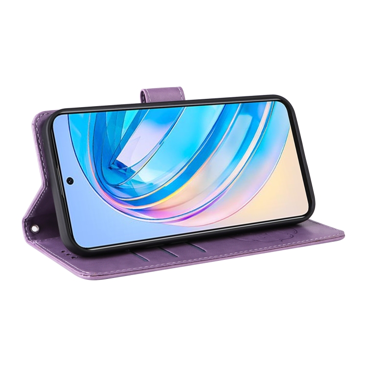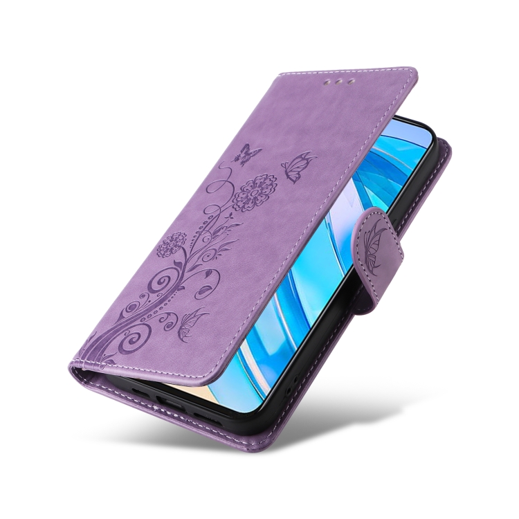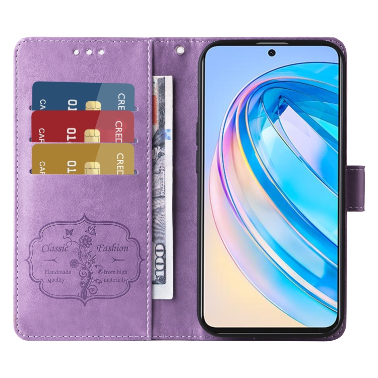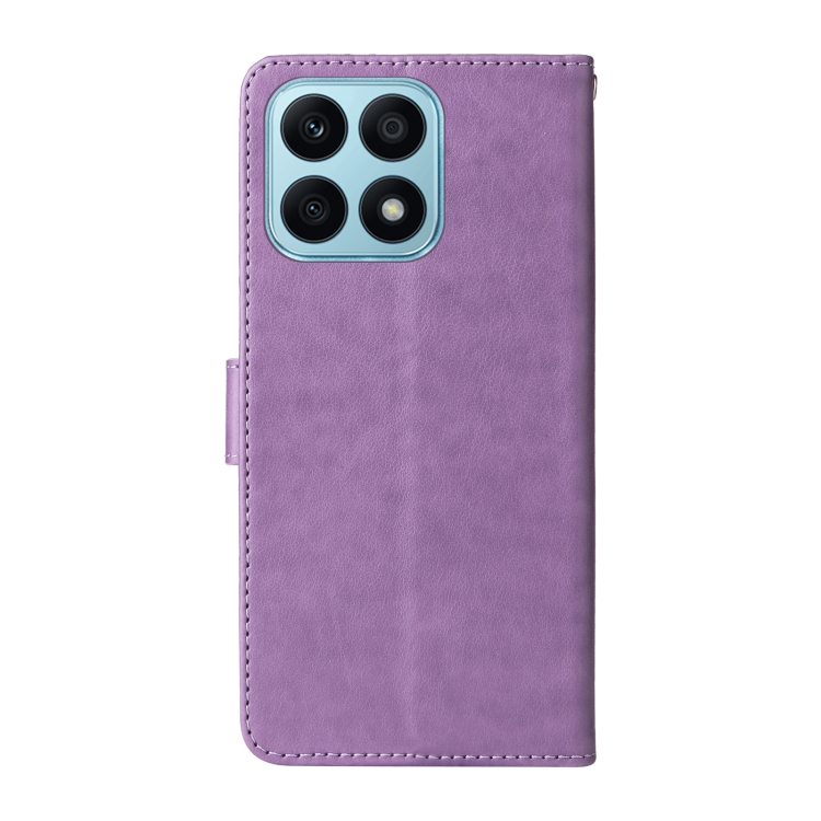 Funda de Cuero para Honor X8A 4G con Diseño de Mariposas y Flores en Relieve (Morado)