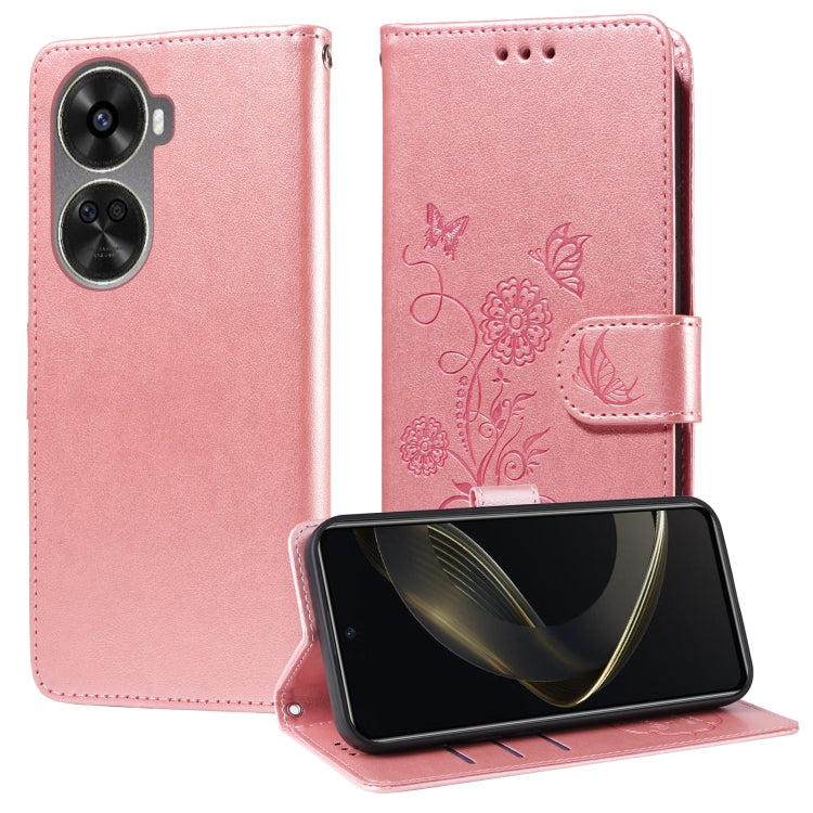 Funda de Cuero Huawei Nova 12 Se 4G con Diseño de Mariposas y Flores en Relieve (Oro Rosa)