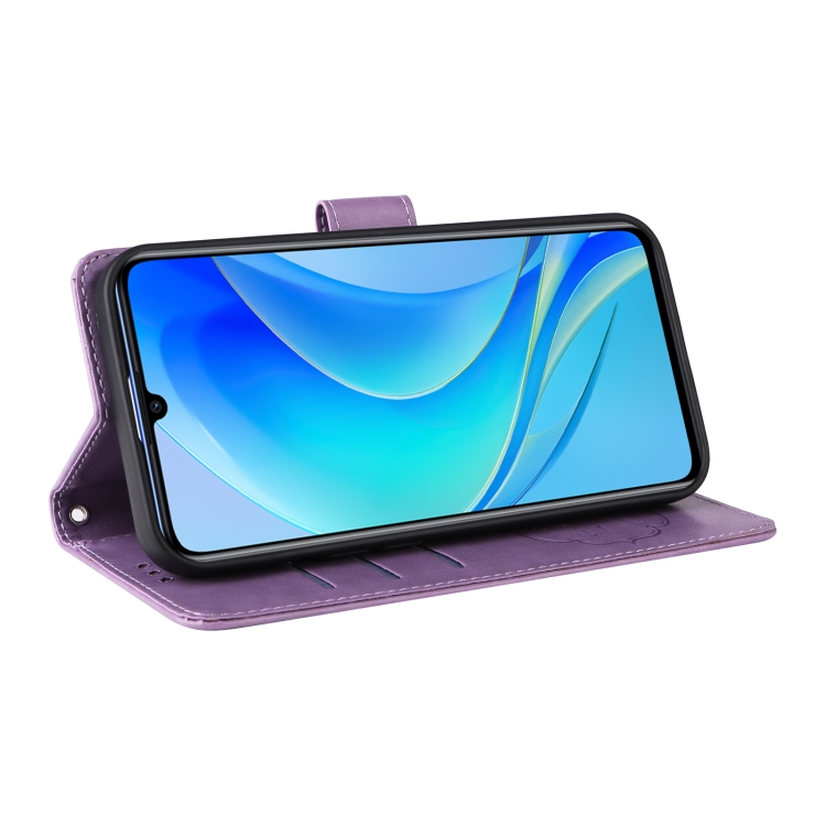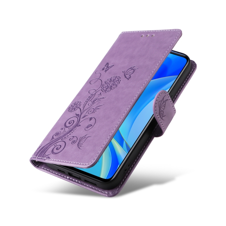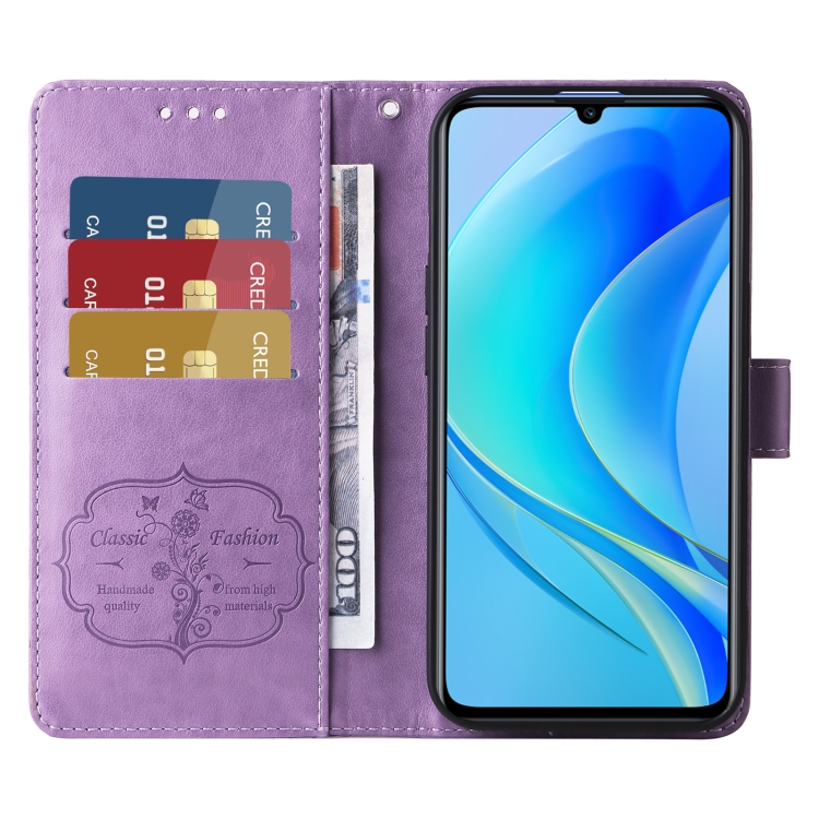 Funda de Cuero Huawei Nova Y70 Plus Diseño Mariposas y Flores En Relieve (Morado)