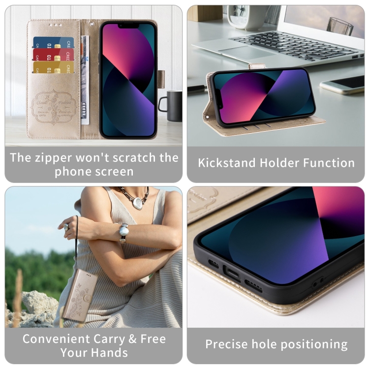 Funda de Cuero iPhone X/Xs Diseño Mariposas y Flores En Relieve (Dorada)