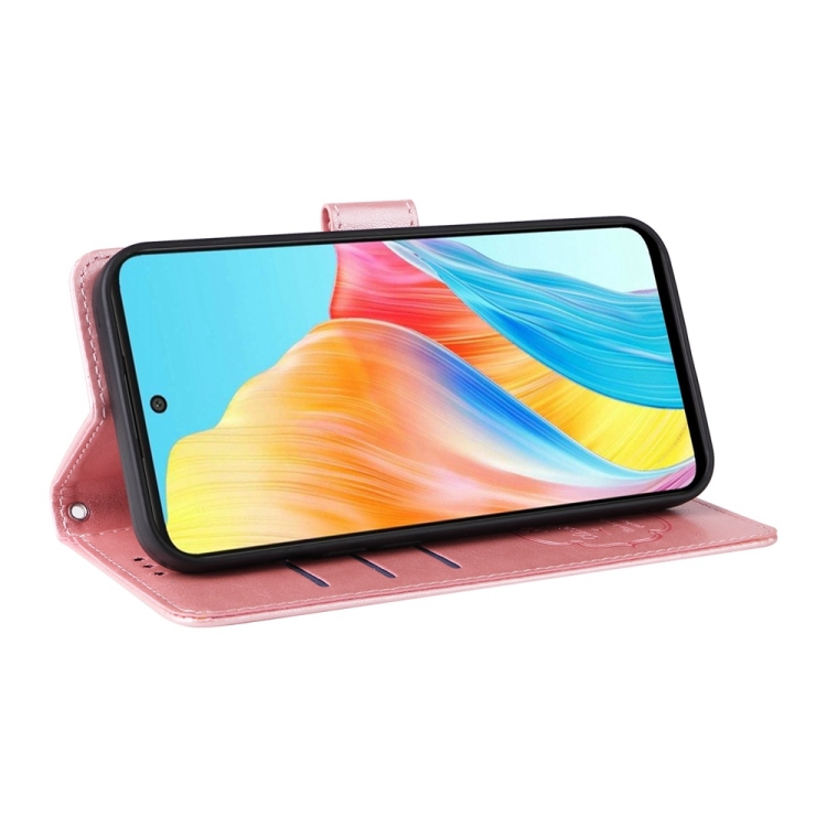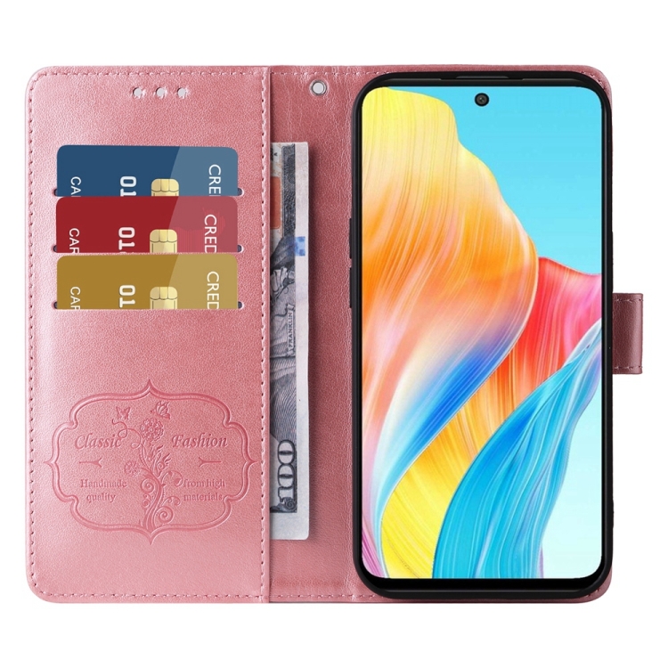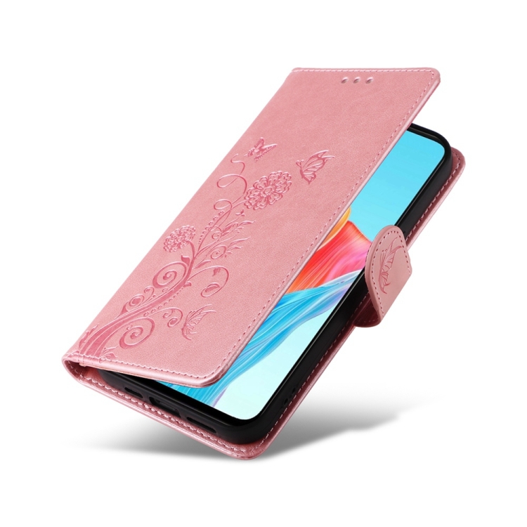 Funda de Cuero con Diseño de Mariposas y Flores En Relieve para Oppo A58 4G (Oro Rosa)