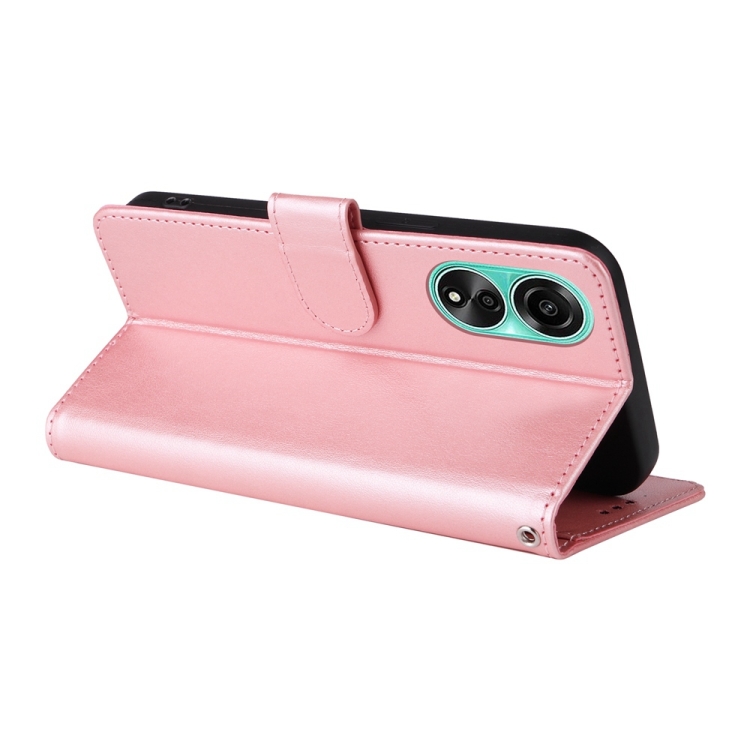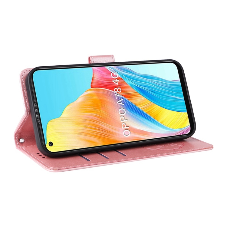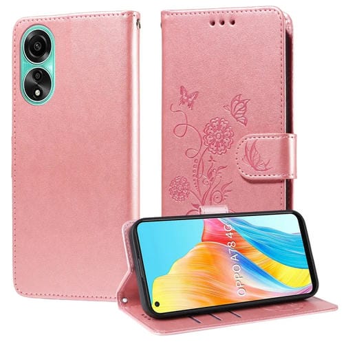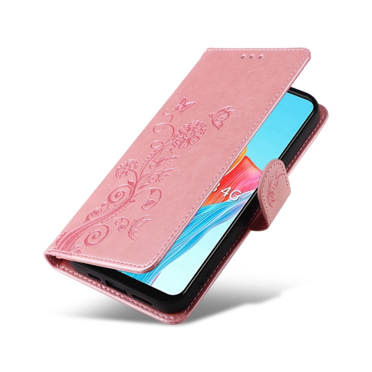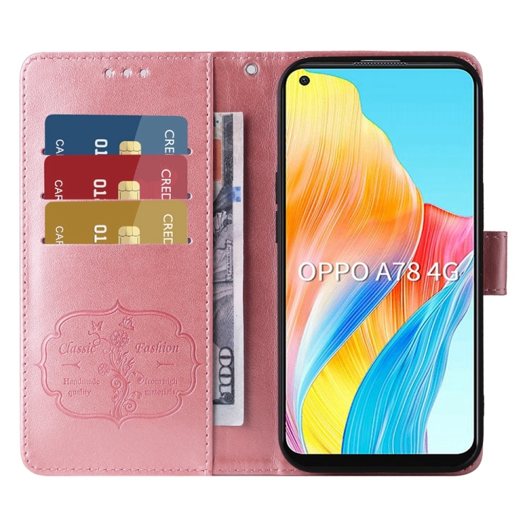Funda de Cuero con Diseño de Mariposas y Flores En Relieve para Oppo A78 4G (Oro Rosa)