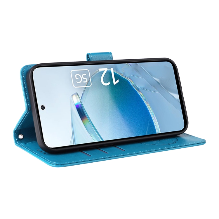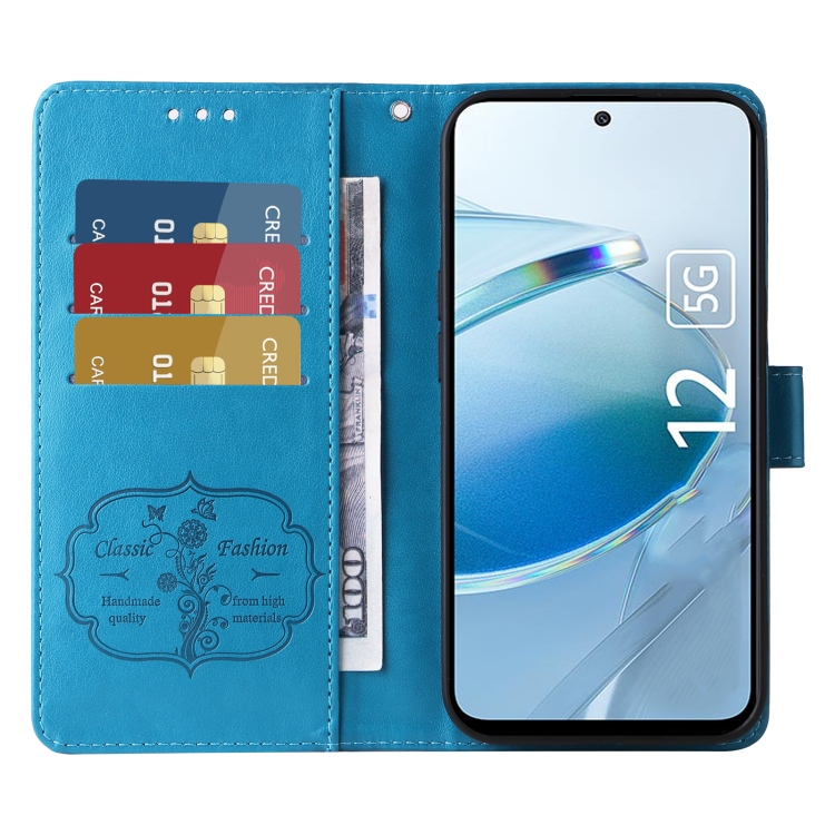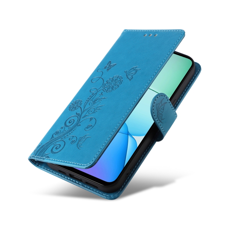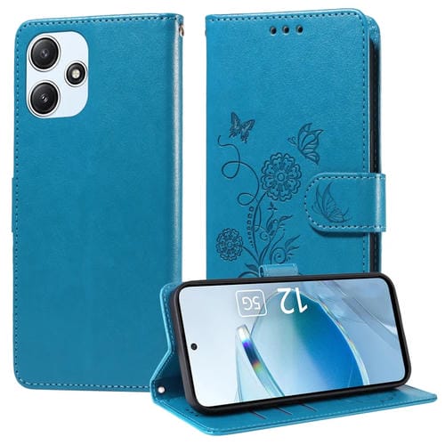 Funda de Cuero con Diseño de Mariposas y Flores En Relieve para Redmi 12 5G/4G/Note 12R (Azul)