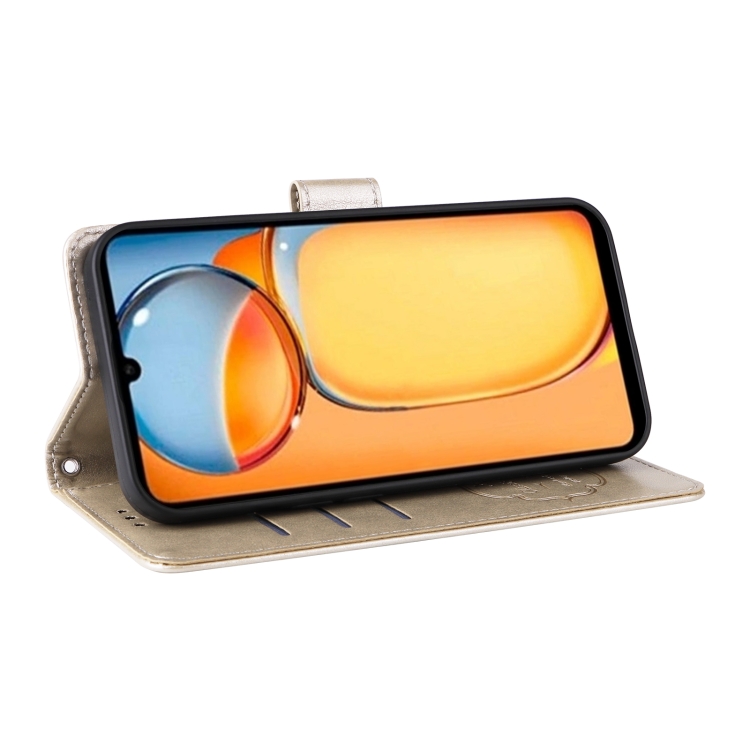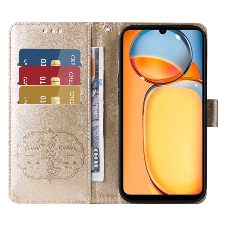 Funda de Cuero con Diseño de Mariposas y Flores En Relieve para Redmi 13C 5G/4G/13R (Dorada)