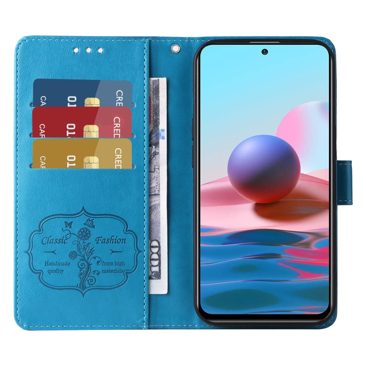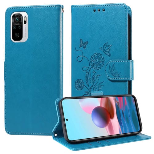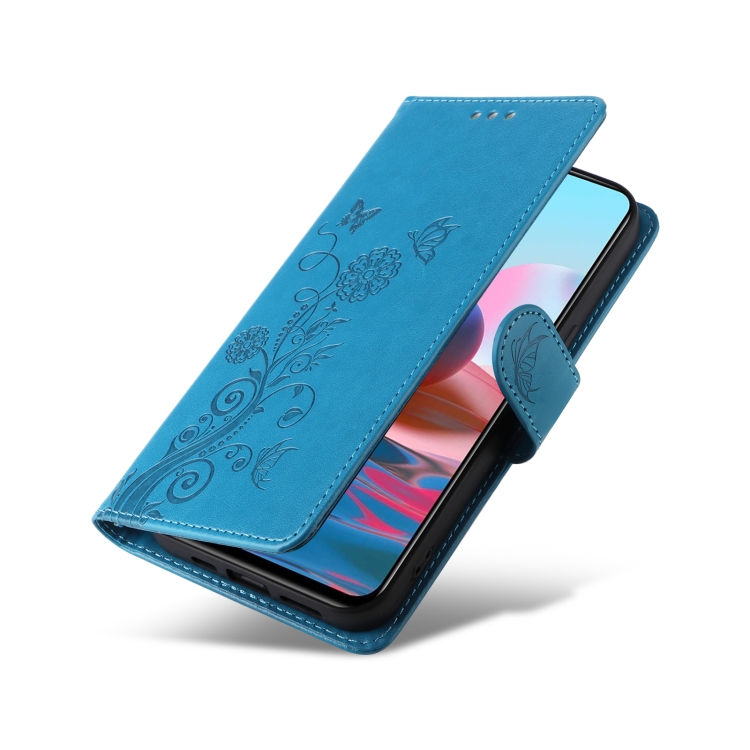 Funda de Cuero con Diseño de Mariposas y Flores En Relieve para Redmi Note 10 4G India/10S 4G (Azul)