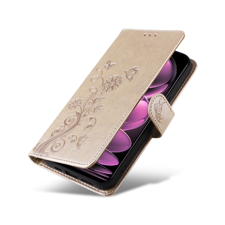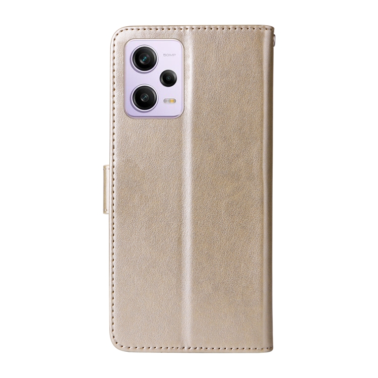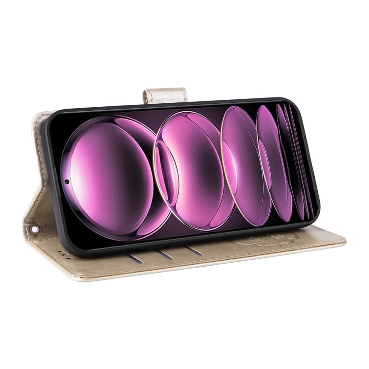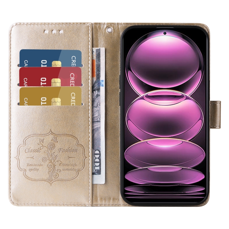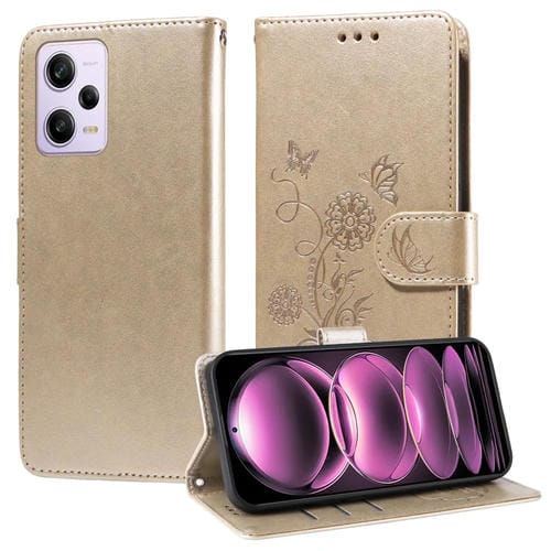 Funda de Cuero con Diseño de Mariposas y Flores En Relieve para Redmi Note 12 Pro 5G (Dorada)