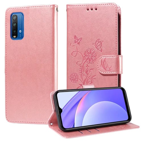 Funda de Cuero con Diseño de Mariposas y Flores En Relieve para Redmi Note 9 4G/10X 4G (Oro Rosa)