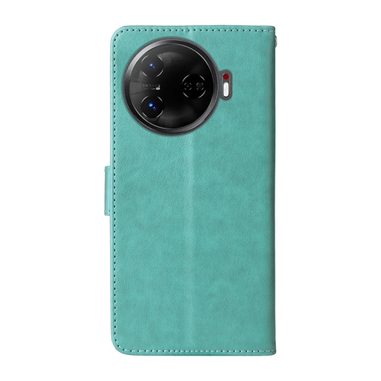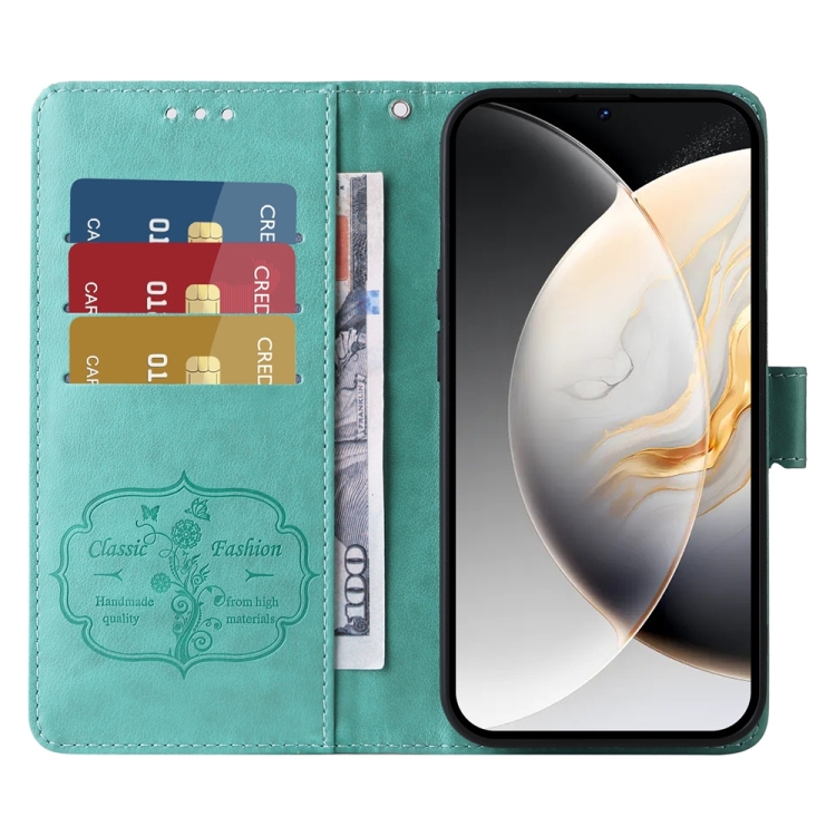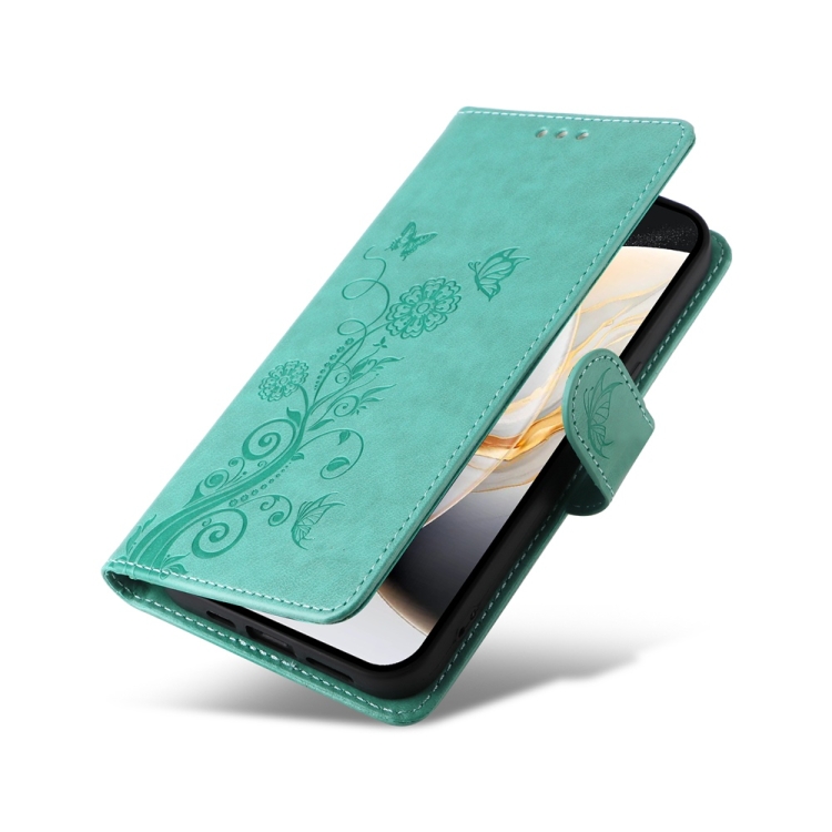 Funda de Cuero para Tecno Camon 30 Pro con Diseño de Mariposas y Flores en Relieve (Verde)