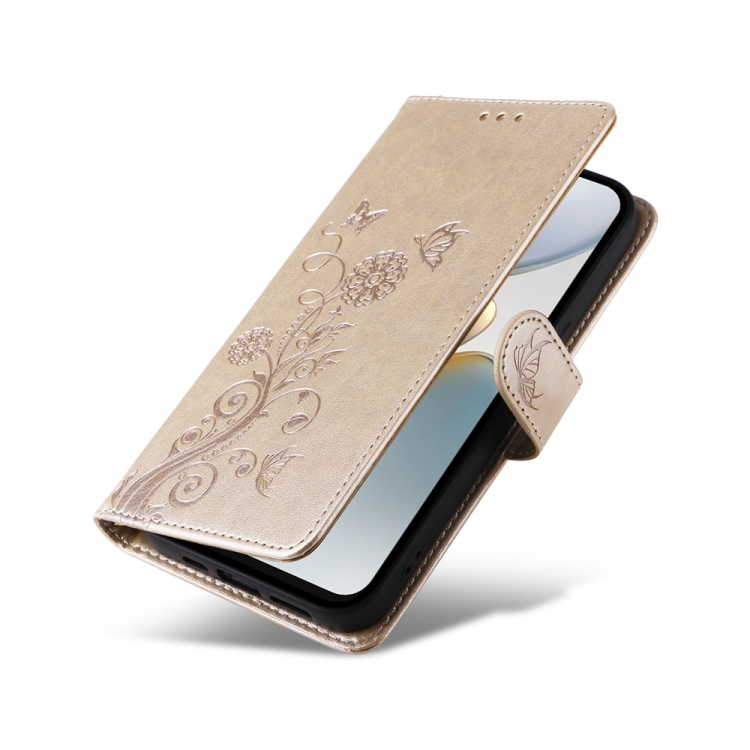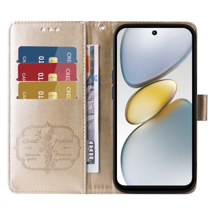 Funda de Cuero para Tecno Spark Go 1 / Pop 9 / Spark Go 2025 con Diseño de Mariposas y Flores en Relieve (Dorada)