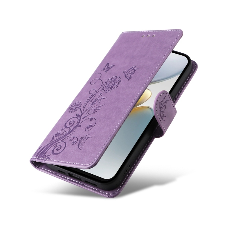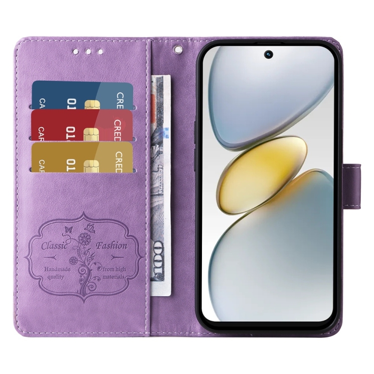 Funda de Cuero para Tecno Spark Go 1 / Pop 9 / Spark Go 2025 con Diseño de Mariposas y Flores en Relieve (Morado)