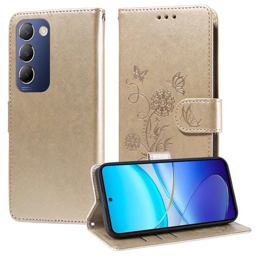 Funda de Cuero con Diseño de Mariposas y Flores En Relieve para Vivo Y100 Idn / Y200E 5G (Dorada)