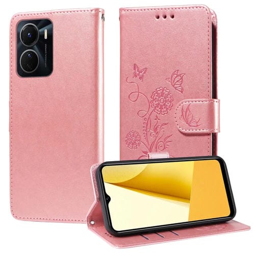 Funda de Cuero con Diseño de Mariposas y Flores En Relieve para Vivo Y16 4G / Y02S / Y56 5G (Oro Rosa)