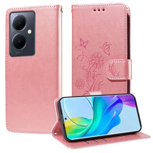 Funda de Cuero con Diseño de Mariposas y Flores En Relieve para Vivo Y78 5G (Oro Rosa)