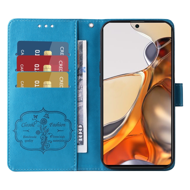 Funda de Cuero con Diseño de Mariposas y Flores En Relieve para Xiaomi Mi 11T/11T Pro (Azul)