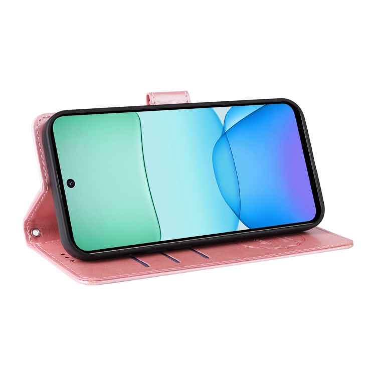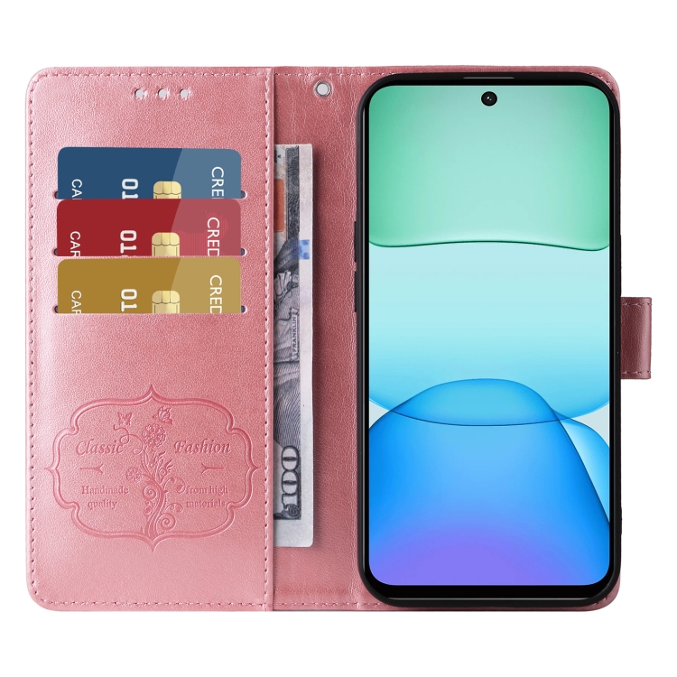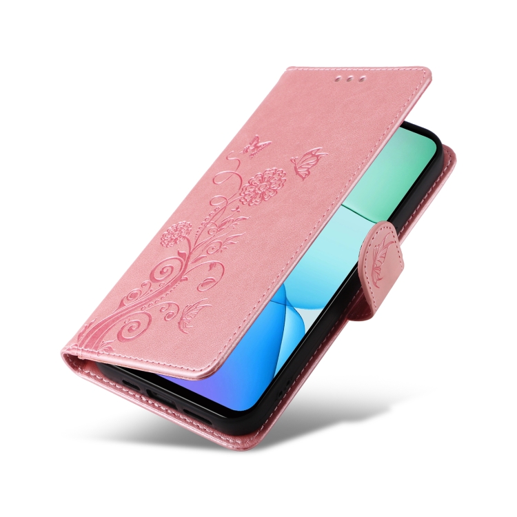 Funda de Cuero con Diseño de Mariposas y Flores En Relieve para Xiaomi Poco M6 4G (Oro Rosa)