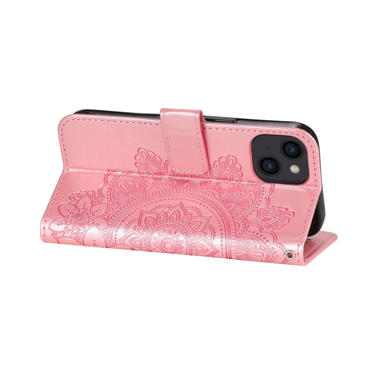 Funda de Cuero iPhone 14 Estampado Flores 7 Pétalos (Oro Rosa)