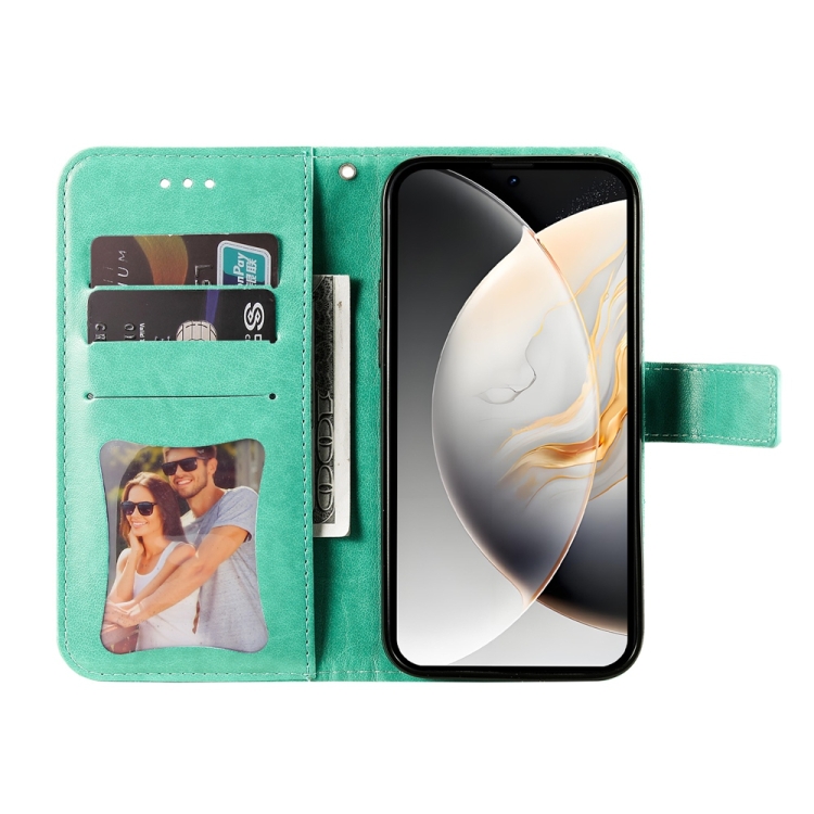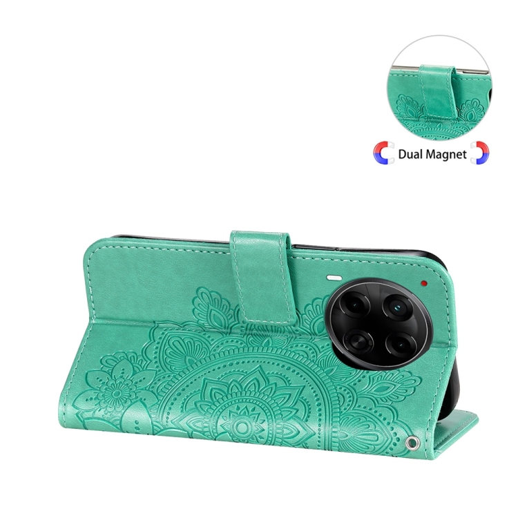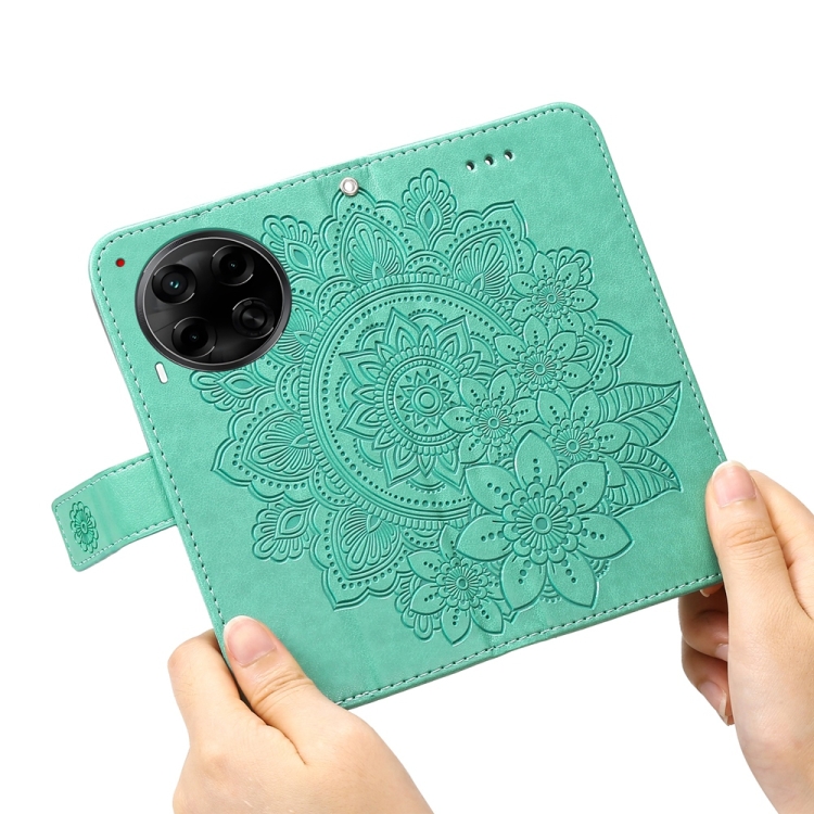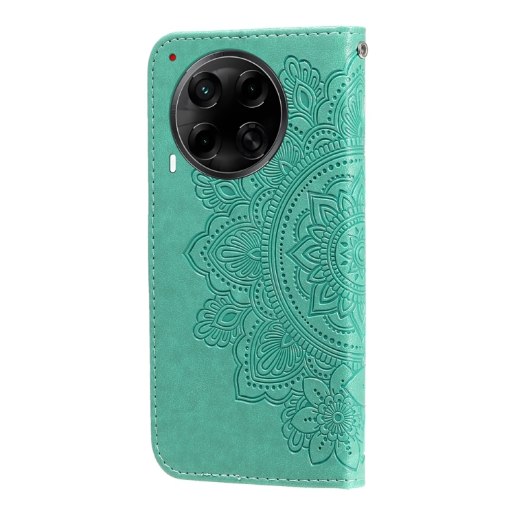 Funda de Cuero para Tecno Camon 30S y Camon 30S Pro con Estampado de Flores de Siete Pétalos (Verde)
