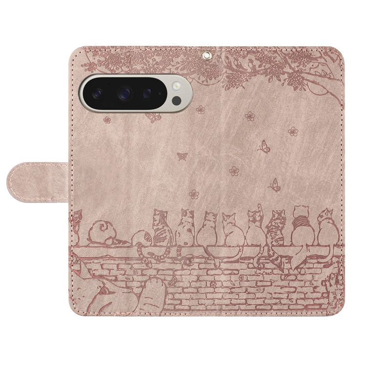 Funda de Cuero Google Pixel 9 Pro XL con Estampado de Gato en Relieve y Cordón (Gris)