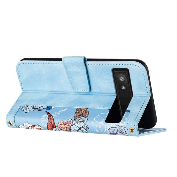 Funda de Cuero con Estampado Floral para Google Pixel 7A con Cordón (Azul Claro)