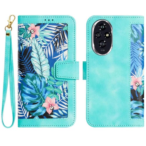 Funda de Cuero Honor 200 Pro con Estampado Floral y Cordón (Verde)
